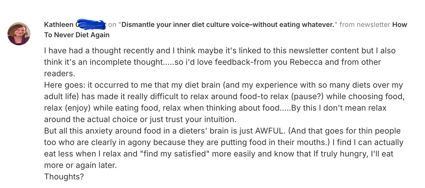 One of the worst effects of weight cycling (dieting to lose, living to gain) is that it creates deep anxiety around the essential functions of living: being hungry, selecting food, and enjoying mealtime.